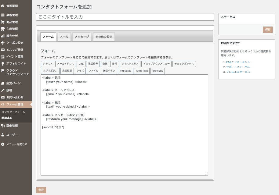 ここではコンタクトフォームに実装するテンプレートを編集することができます。