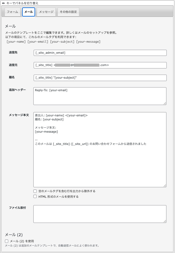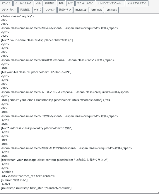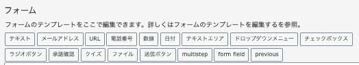 テンプレート編集では、HTML および Contact Form 7 のフォームタグが利用できます。