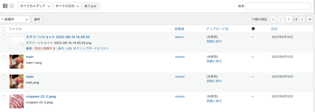 一括捜査では、メディアを選択し「削除」することができるので、使用していないメディアを管理画面から消去できます。