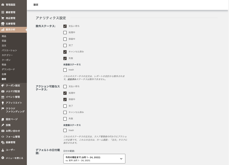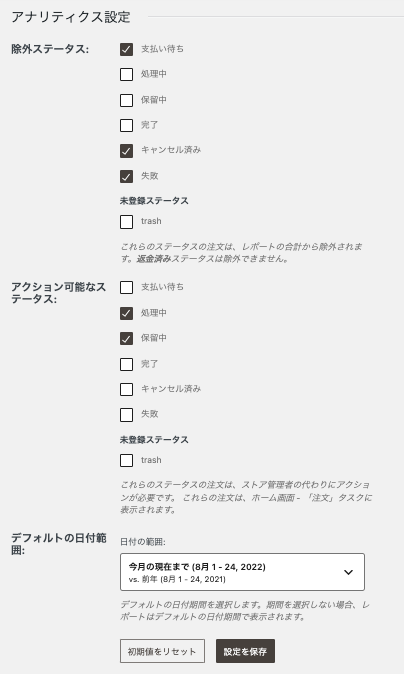 「除外ステータス」「アクション可能なステータス」「デフォルトの日付範囲」など、各項目で選択項目を指定し、設定を保存できます。