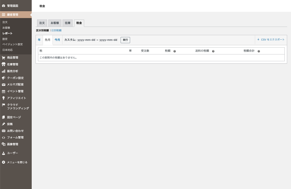 顧客管理-レポート-税金 管理画面 Twitter Facebook はてブ Pocket LINE コピー 2022.08.30 2022.08.15 目次 レポート税金タブ レポート 顧客管理>レポート>税金でクリックすると、画像のような選択タブが表示されます。左から順に「注文/お客様/在庫」と選択でき、それぞれのテーマに合わせた集計結果を確認することができます。 税金タブ 税金タブは売上に対する税金の金額がわかります。「税率/受注数/税額/送料の税額/税額合計」が表示されます。