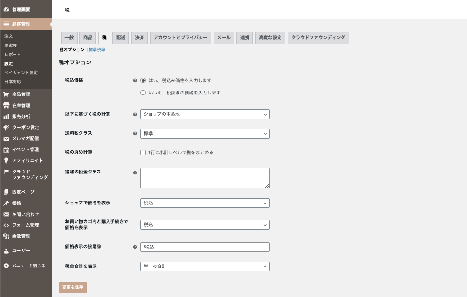 ・送料税クラス:「標準/お買い物カゴの商品の応じた税」から送料の税金が指定できます。
