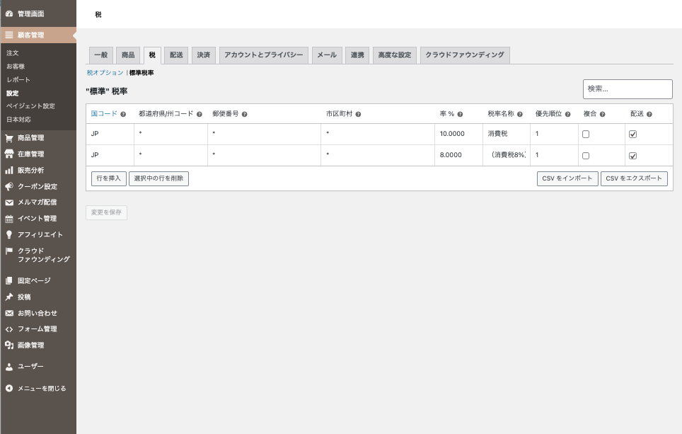・追加の税金クラス:各行に1個、軽減税率などを追加でき、「標準税率」に付加します。